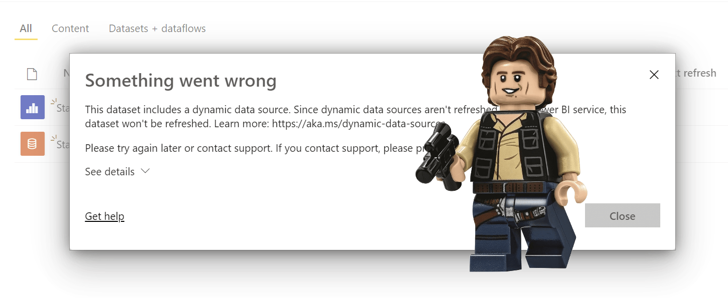 Then I do the important test, does it refresh? When I click on refresh it fails, and when I click on the small red triangle it gives an error stating the dataset uses a dynamic data source and these can’t be refreshed.